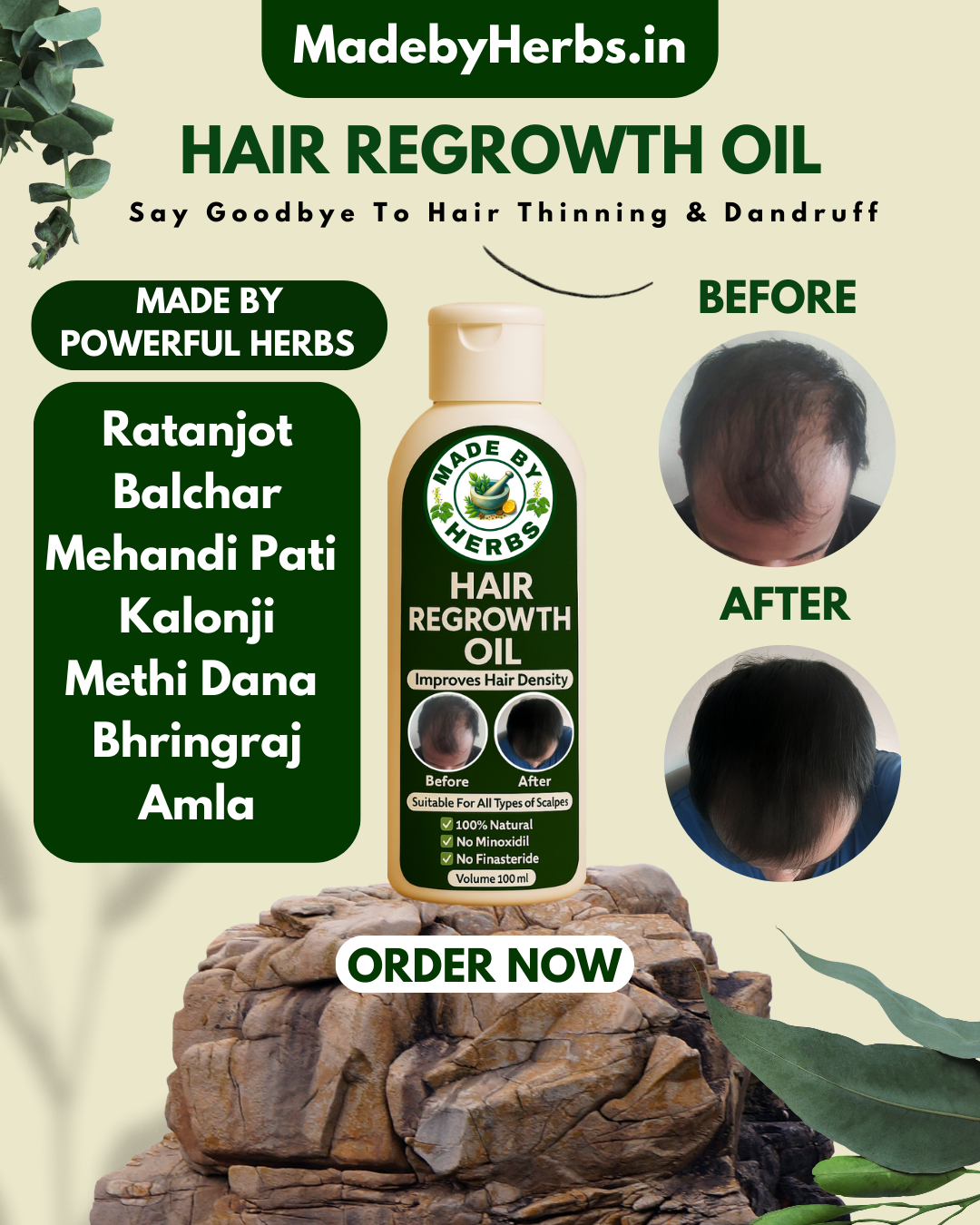 Yes ๐ฟ. MadeByHerbs Hair Regrowth Oil is made with powerful herbs like Bhringraj, Brahmi & Ratanjot that improve scalp circulation and strengthen hair roots, reducing hair fall naturally.